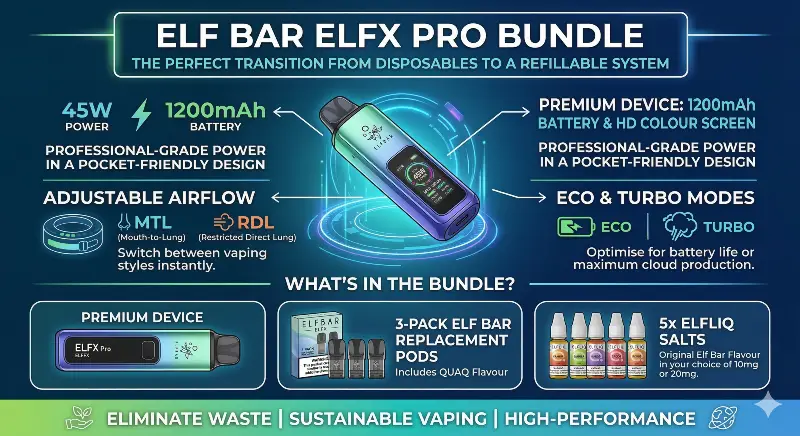 Upgrade your vaping game with the ultimate Elf Bar ELFX Pro Bundle. This comprehensive kit is designed for vapers who love the intense flavour of Elf Bar disposables but want a more powerful, sustainable, and customisable experience.